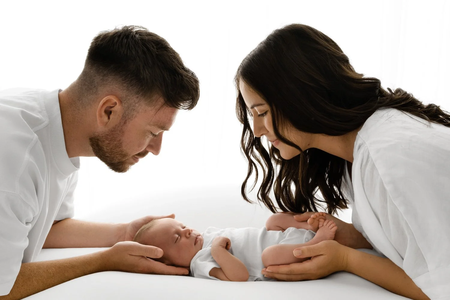 There are beautiful ways to include both parents in a photograph with their baby that look completely natural and loving. Both parents leaning in together over their baby who is resting on the beanbag. One parent holding the baby while the other rests a hand gently on them. Parents sitting either side of their newborn looking down at them together. All of these create images where you can see both parents and the baby and every single person looks like they are exactly where they want to be.