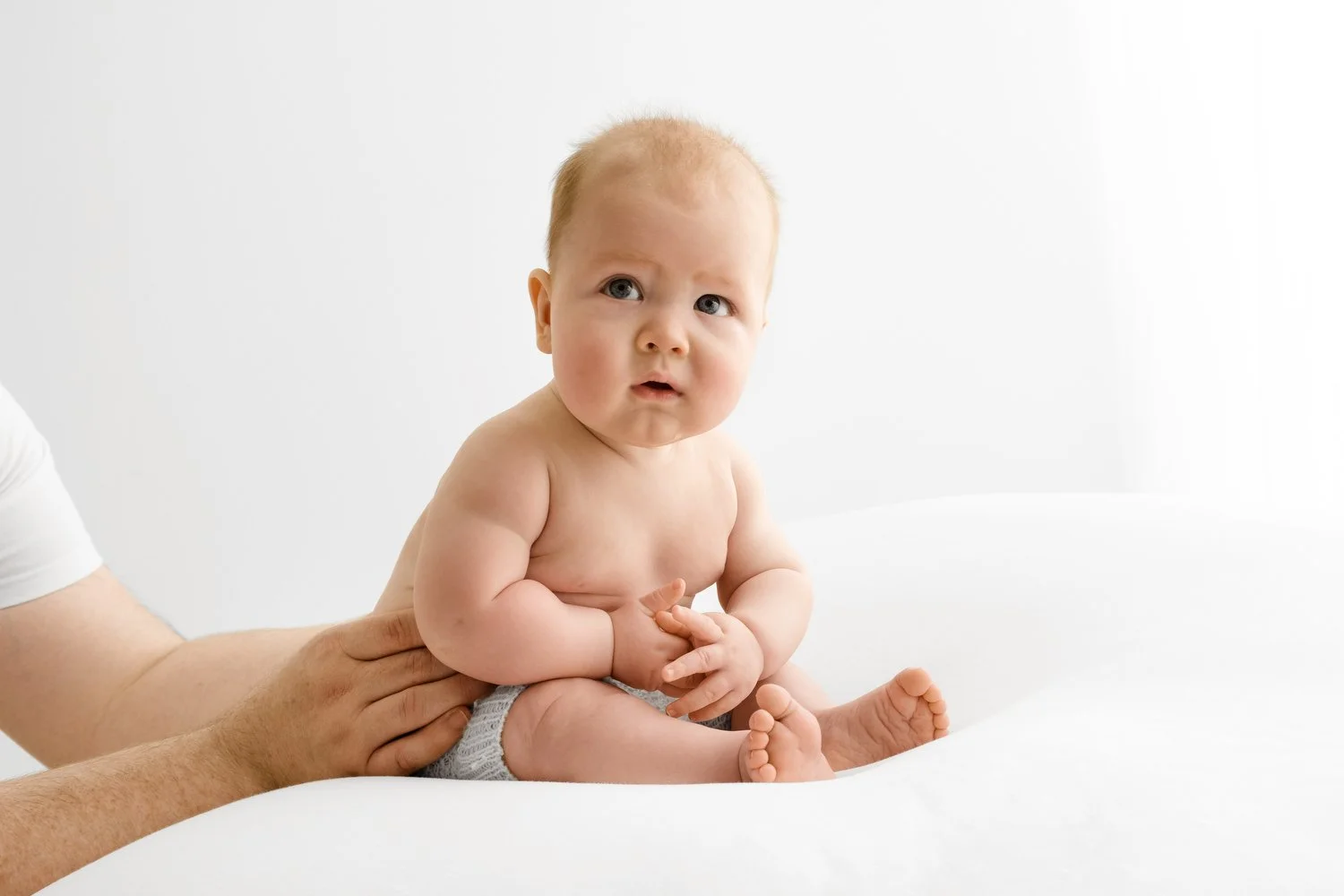 Ask a parent to hold their baby in a sitting position supported in their hands or against their chest. At four months baby has enough neck and core strength to hold their head up well in this position and the portraits you get are full of personality and connection.