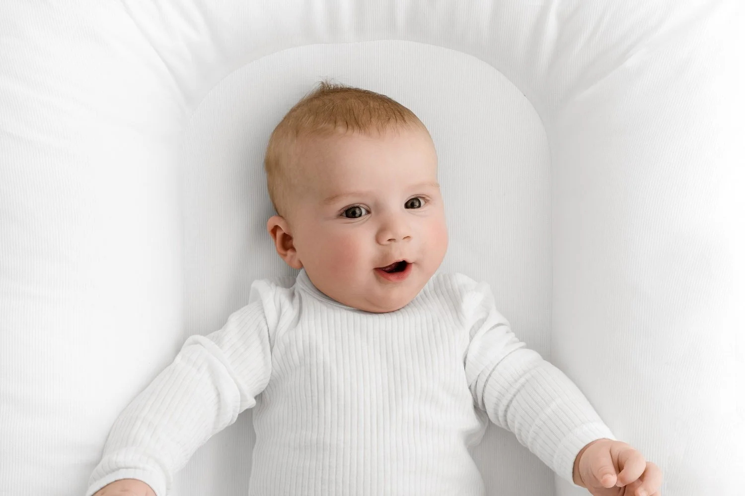 At four months the propped cushion position is becoming more achievable than it was at three months. Baby is stronger and better able to hold themselves with a little support behind them. It is still worth being honest with yourself about whether it is working. If it is taking too long or the baby keeps slumping, move on. A beautiful image of baby lying on the beanbag or being held by a parent will always be chosen over a forced sitting portrait.